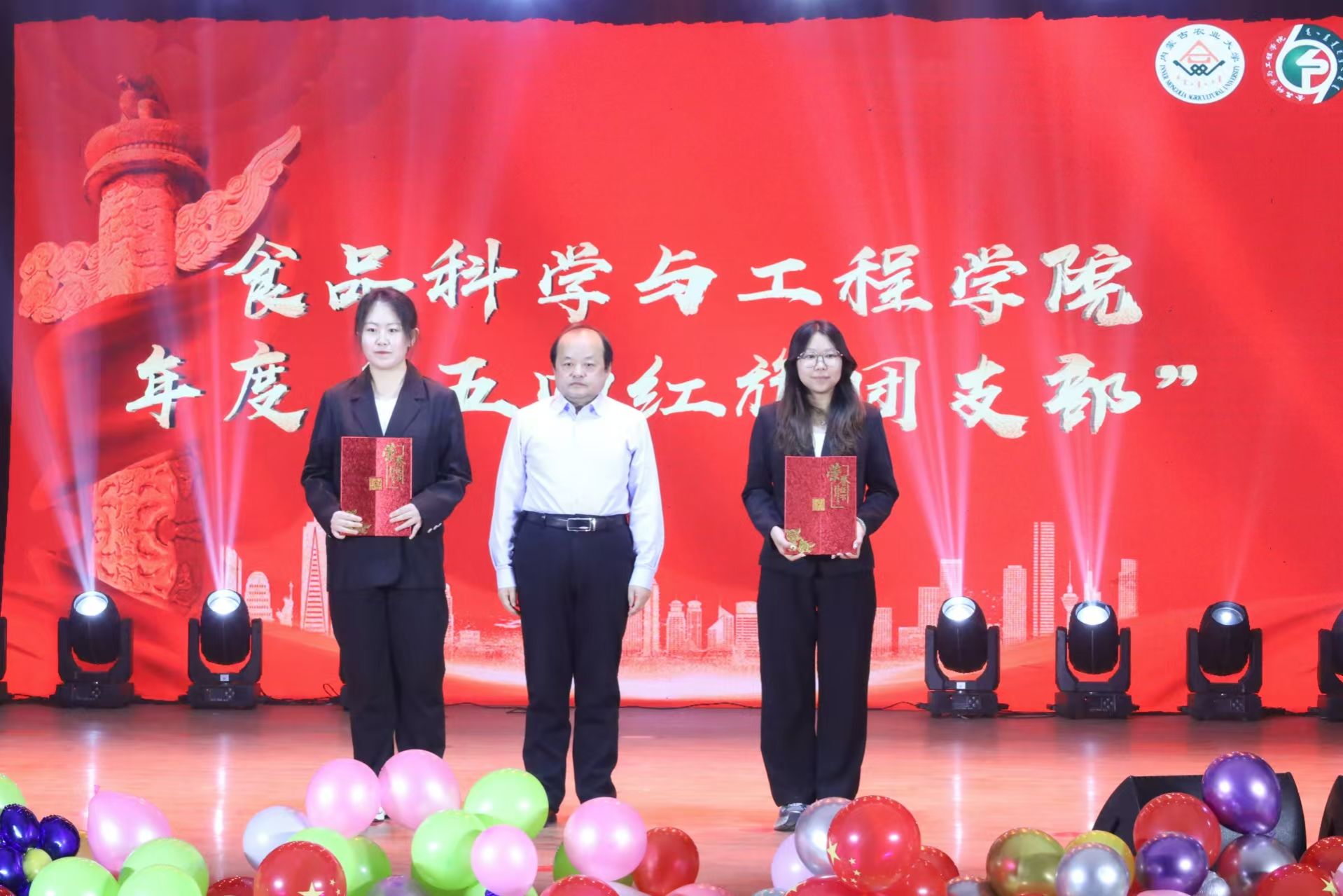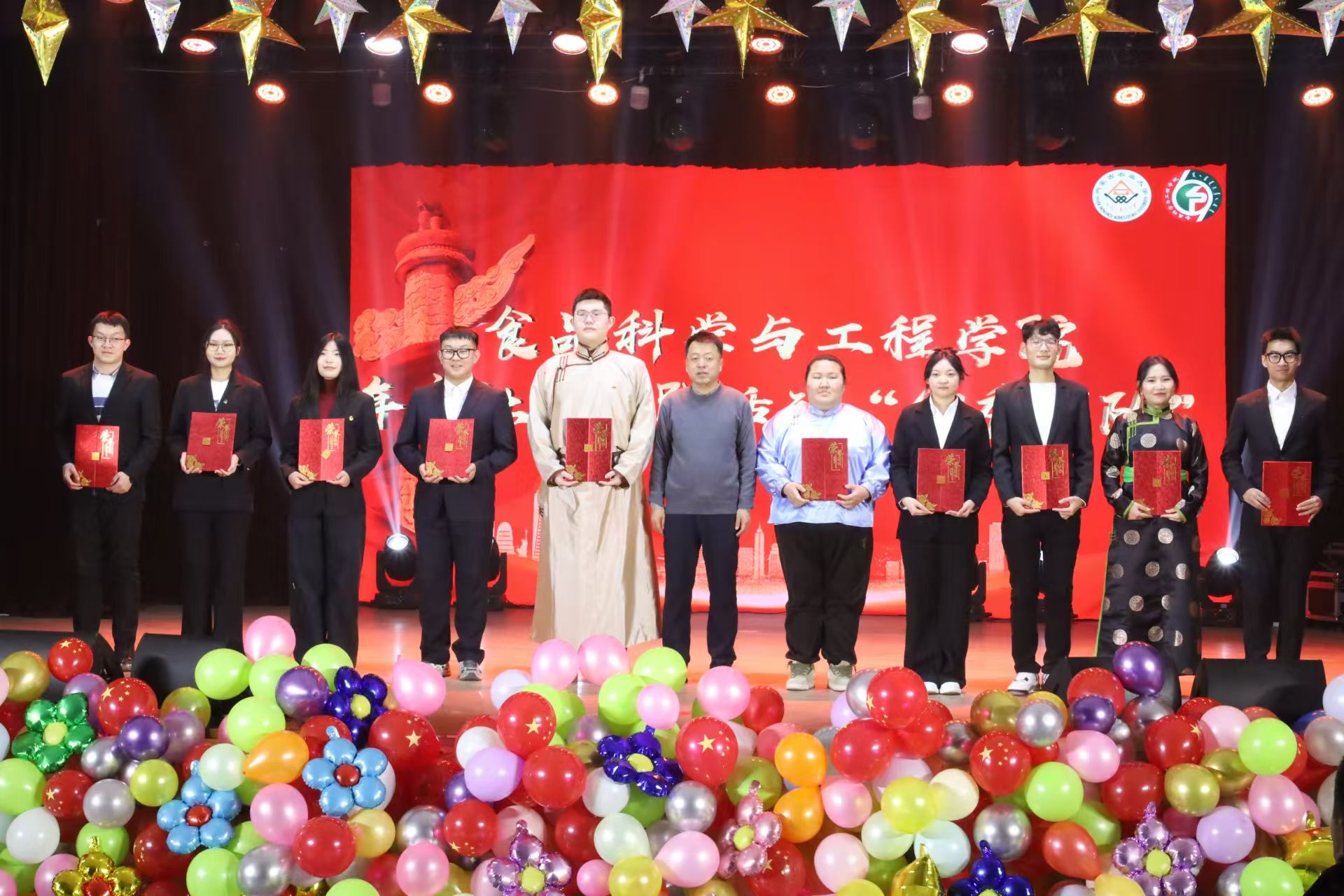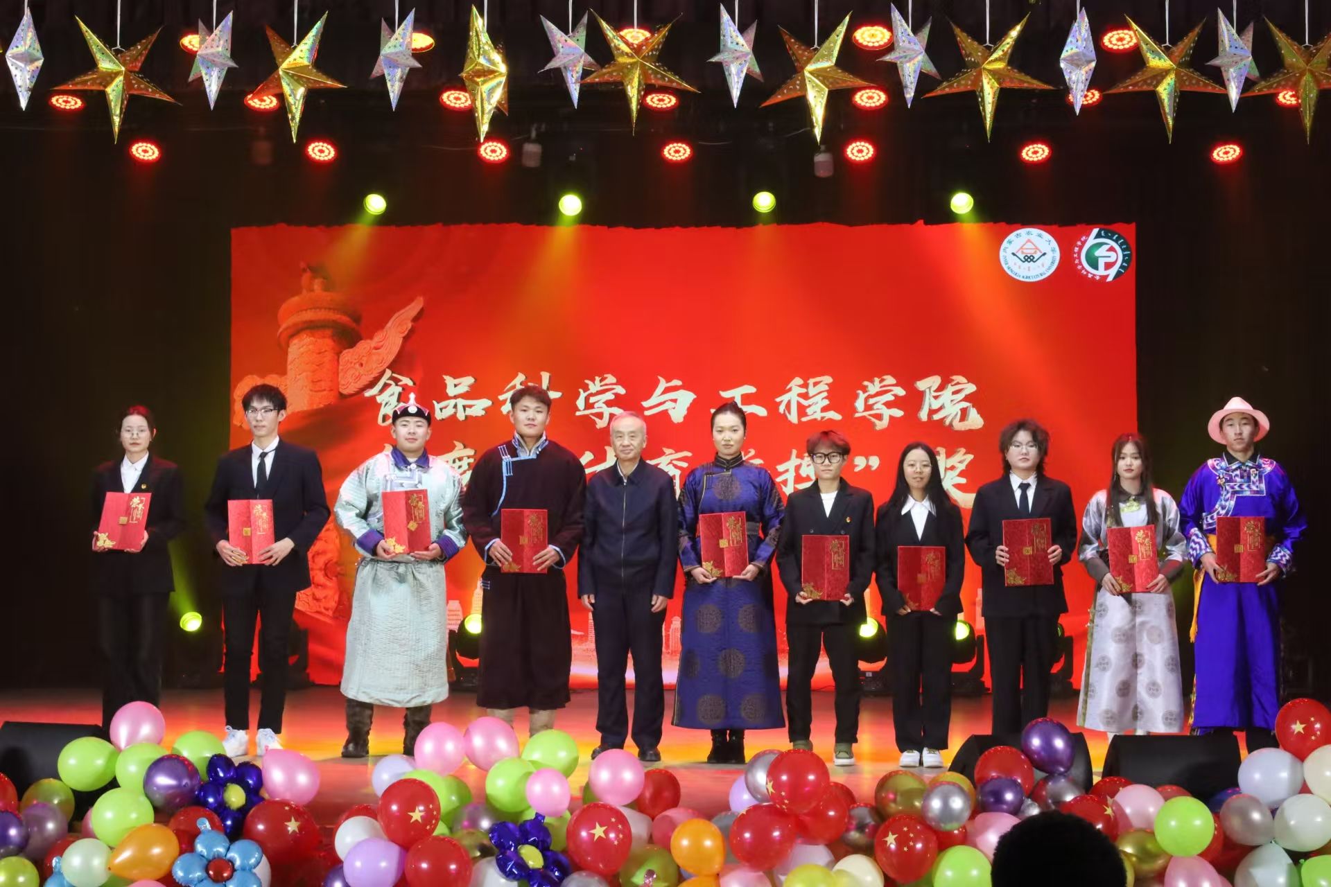 到场的领导和嘉宾分别为获得年度“五四红旗团支部”“优良学风班集体”“创新创业优秀团队”“优秀班主任”“学习标兵”、社会实践活动“优秀团队”“体育拼搏个人”“文明宿舍”“伊利”奖学金的38个优秀集体与57位优秀个人颁奖并合影留念。