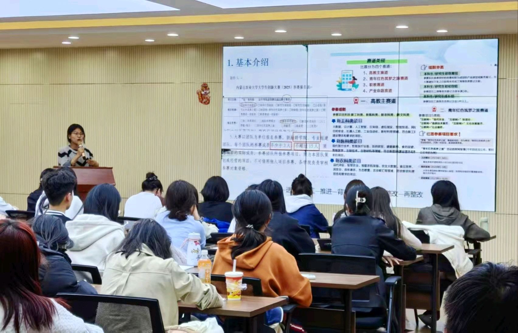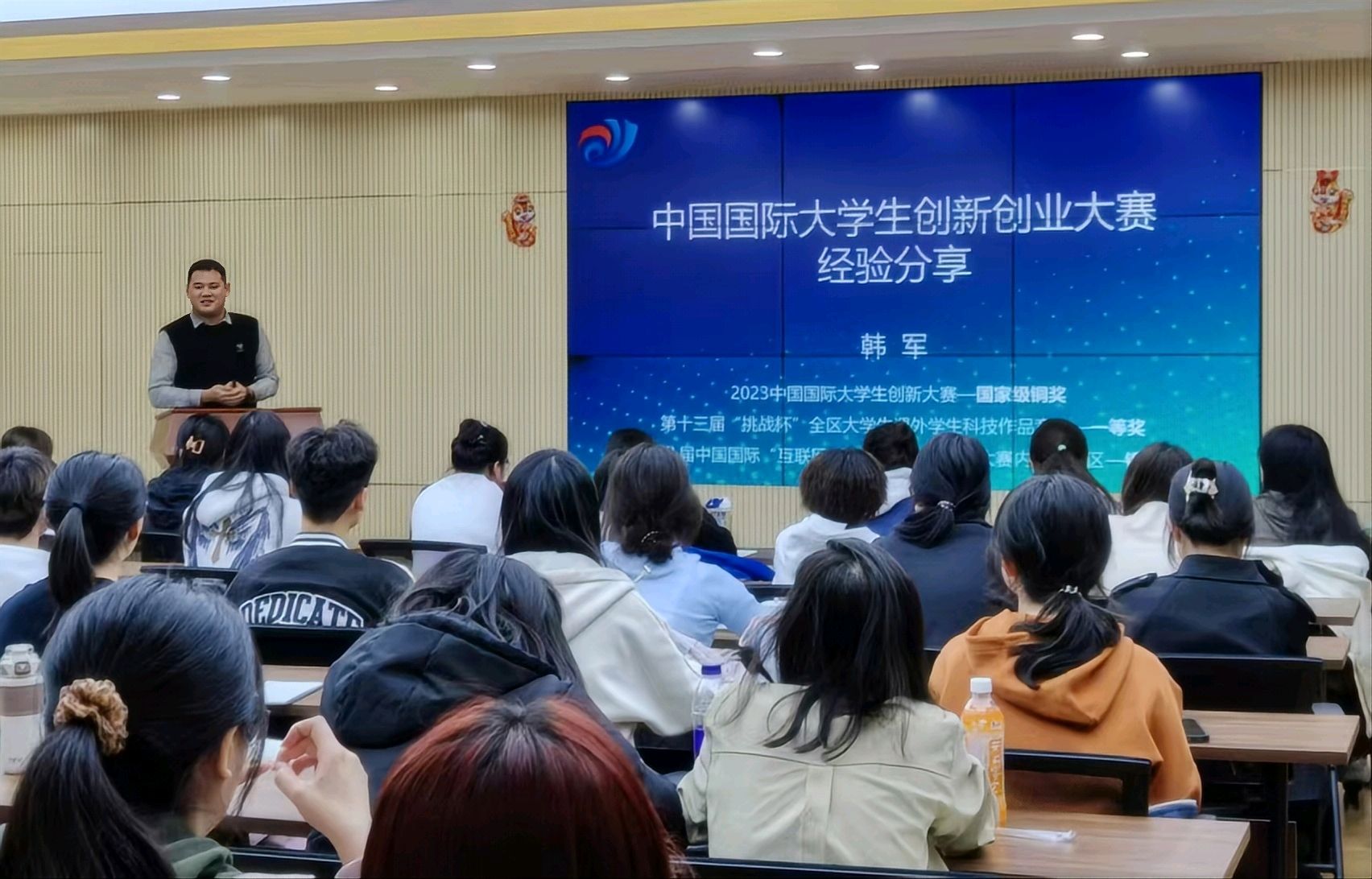 中国国际老员工创新创业大赛国家级铜奖获得者韩军、自治区级银奖获得者郝思甜针对参赛细则、选题类型、规则流程、备赛事项等方面进行了详细地讲解,并通过典型案例分析强调创新思维培养,同时分享了团队组建与管理经验,为参赛团队建设提供实践指南。