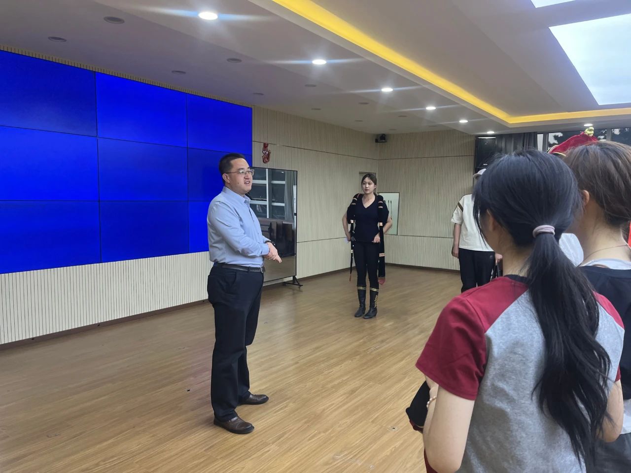 在排练场地,张鹏飞副书记认真观看了演员们的全程排练。舞台上,队员们身姿矫健、动作规范,随音乐节奏灵动起舞,旋转、跳跃间尽显力量与美感,队形变换整齐划一、衔接流畅,充分展现了多日集训的扎实成果。张鹏飞副书记对同学们不怕吃苦、精益求精的态度给予高度赞扬,肯定了大家为备战比赛付出的辛勤努力。