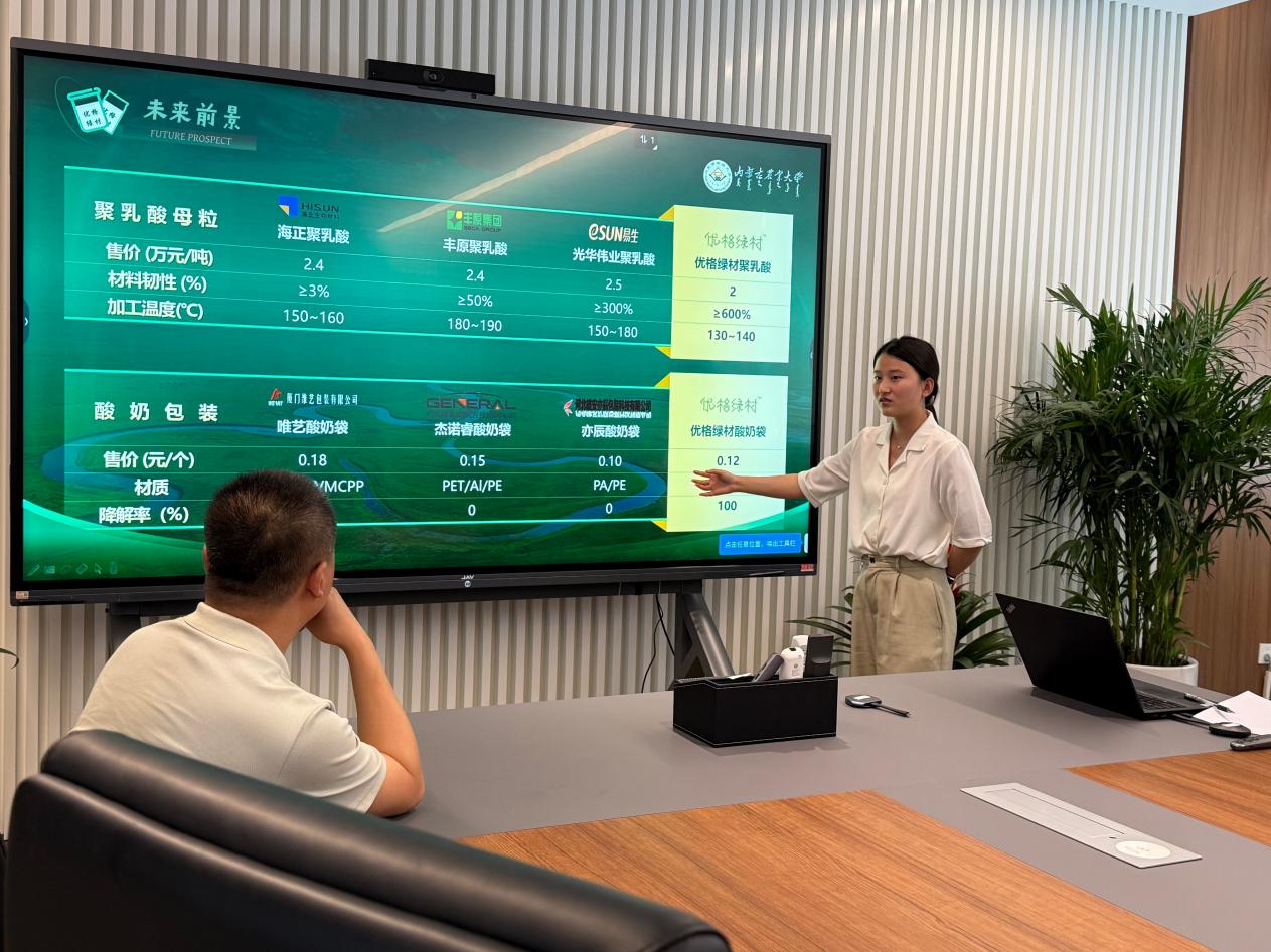 活动现场,博士生杜佳慧围绕团队核心研究项目——聚乳酸基生物可降解材料,进行了详细阐述。她提到,传统 “两步法” 合成聚乳酸工艺繁琐,而团队自主研发的 “一步法” 技术将两道工序简化为一道,大幅缩短工艺流程,有效降低生产能耗与设备投资成本,产率提升30%,通过“内增塑、内扩链”技术合成出高分子量高韧性 PLLA,提高了聚乳酸作为乳品包装性质,初步确定聚乳酸基材料可以用于乳品包装,可替代传统不可降解包装材料,且包装的酸奶保质期已达到现有包装材料水平。通过具体案例,杜佳慧还展示了团队在聚乳酸基生物可降解材料研发方面取得的最新成果,并强调了其在推动乳业绿色包装技术革新中的重要作用。