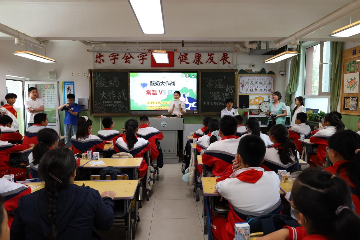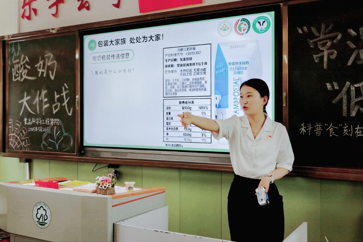 在后续的课堂中,杜佳慧从营养成分、保质期、储存条件到包装特点,逐一剖析常温和低温酸奶的区别。并且设计有关科普知识的问答互动环节,鼓励同学们主动思考、积极提问,现场讨论热烈,同学们也非常积极参与活动,主动举手回答问题。