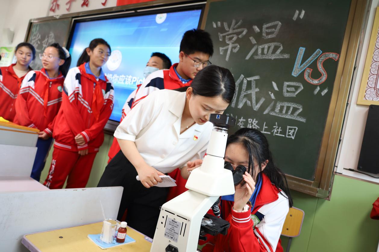 随后进入了本次科普课的高潮——显微镜观察微观世界环节。团队成员提前准备好载玻片和显微镜,杜佳慧耐心指导同学们如何正确使用显微镜。当同学们小心翼翼地将含有乳酸菌的样本放置在显微镜下,慢慢调节焦距,一个个奇妙的微观世界逐渐清晰呈现在他们眼前。对于从未见过的世界,同学们表现出了极大的热情,纷纷参与进环节当中。