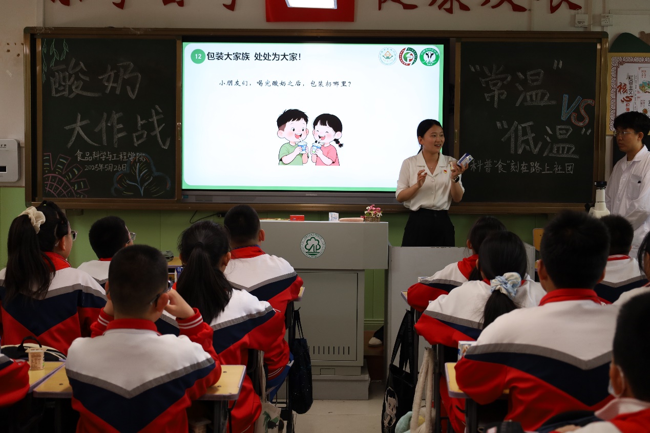 5月26日下午,在公司云雪艳副教授协调组织下,公司绿色食品包装工艺与材料内蒙古高等公司创新团队、包装工程党支部和博士生党支部、科普“食”刻在路上社团联合内蒙古奶业协会、乳业时报携手走进williamhill官网附属公司,为同学们开展了一场别开生面的乳制品及其包装的科普课。乳业时报记者部主任封斌、内蒙古奶业协会那木日、绿色食品包装工艺与材料内蒙古高等公司创新团队成培芳副教授、石硕博士、杜佳慧博士生等一行共同参与,通过构建科普教育新平台,让营养健康和生态文明理念在孩子们心中生根发芽。