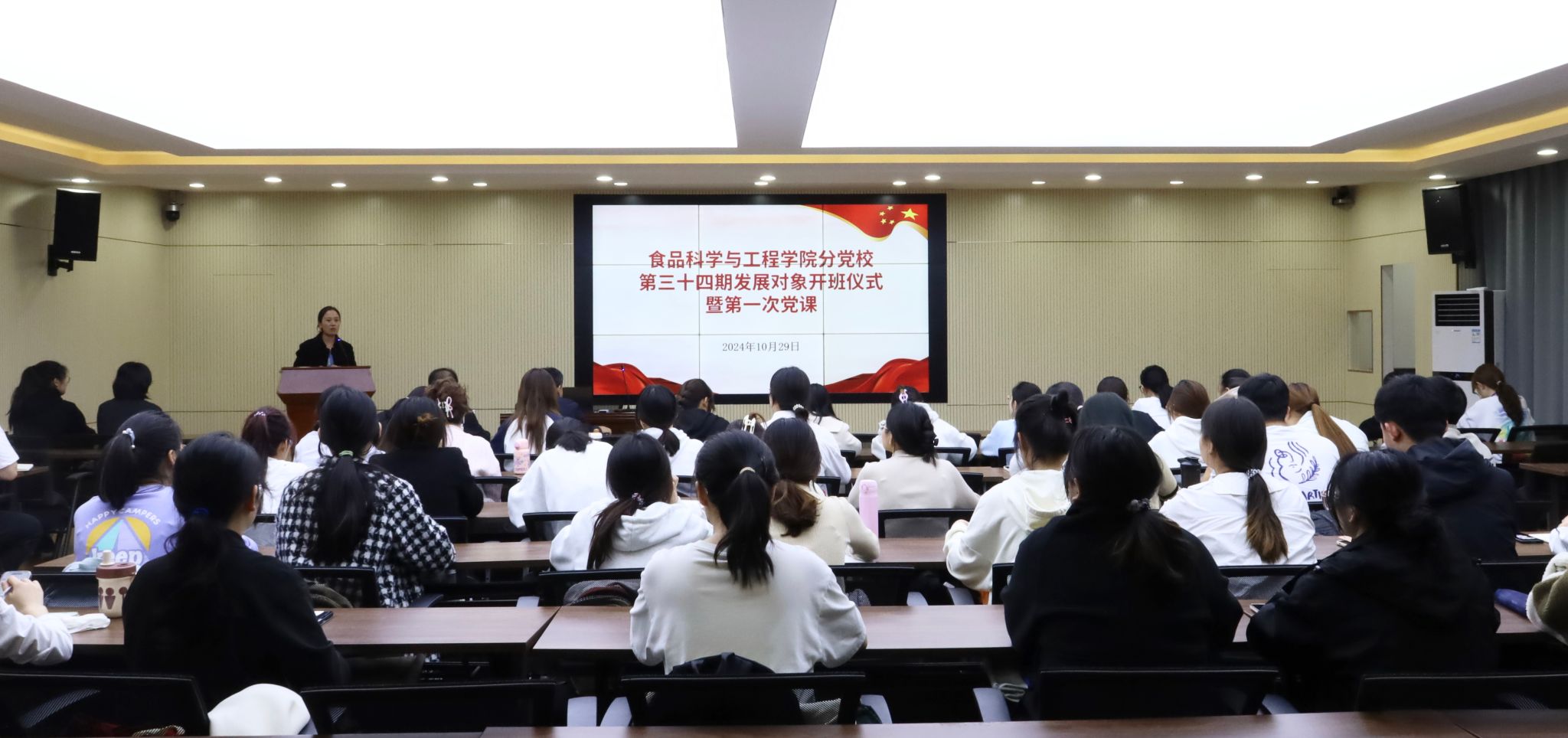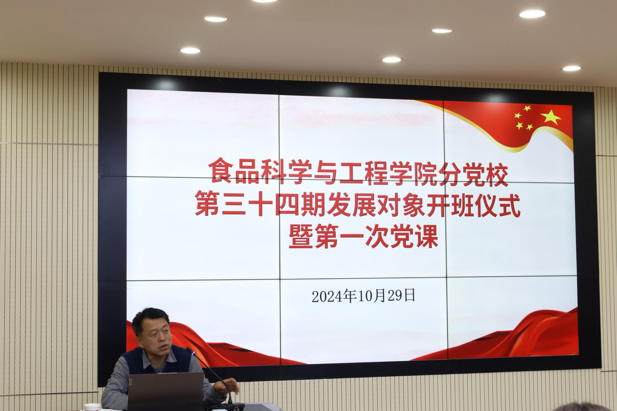 2024年10月29日晚19:00,食品院分党校第三十四期发展对象培训班开班仪式暨第一次党课于乳品楼二楼会议室顺利举行。公司党委书记杨建军、公司党委副书记张鹏飞、第三十四期发展对象及员工党员服务站成员参加。