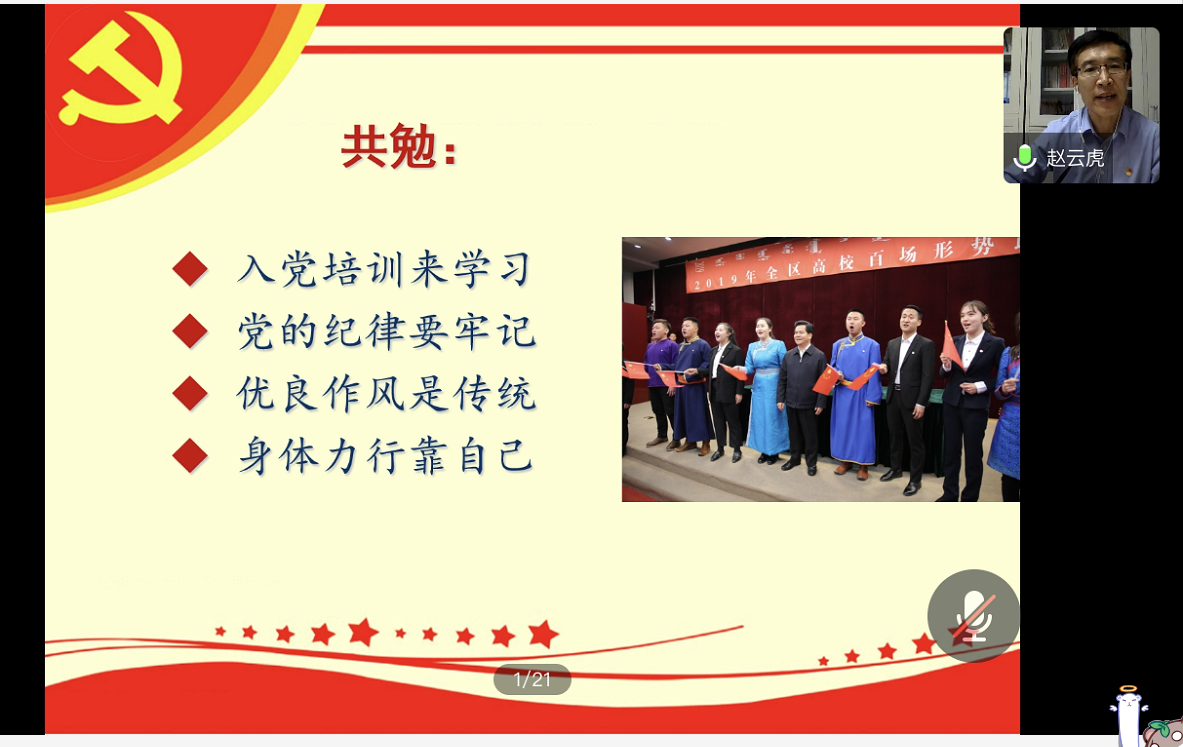 5月25日晚7:00,公司分党校第25期发展对象培训班第一次党课在线上顺利开展。本次党课由公司草原与资源环境公司党委书记赵云虎老师主讲,学办老师王彩霞、各支部书记以及公司51位发展对象参加此次培训。