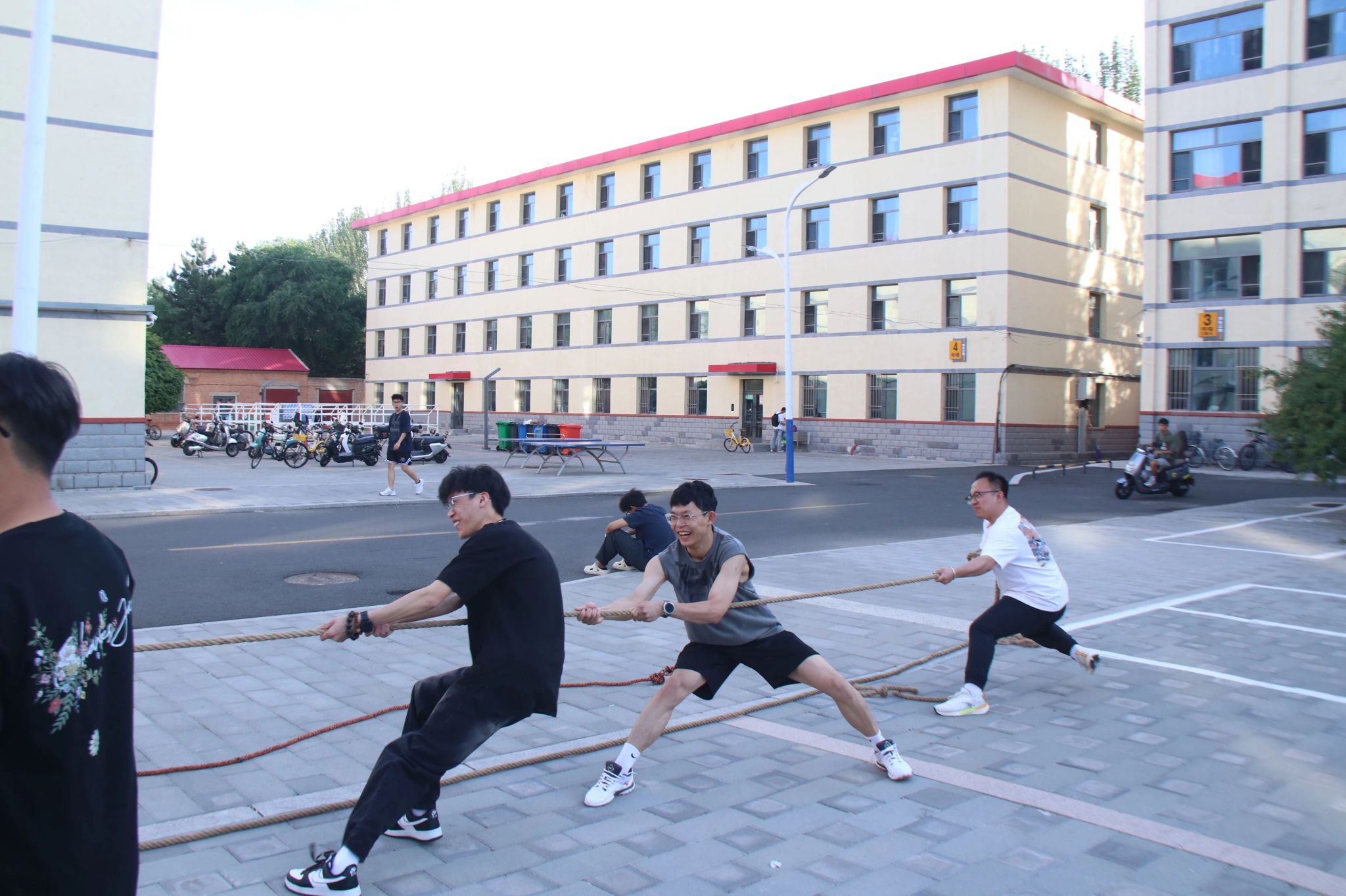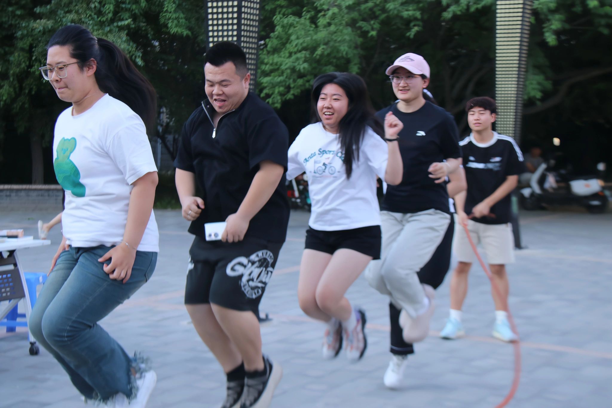 本次趣味运动会设置了“拔河”和“集体跳绳”两项经典团体项目,将竞技性与趣味性深度融合。拔河比赛中,参赛队员们双手紧握麻绳,身体后倾形成一弧线,双脚如锚般稳稳扎根地面。随着裁判的哨声,双方队员瞬间爆发出强劲合力,“一二!一二!”,口号声响彻全场。集体跳绳环节同样精彩纷呈,充分展现了团队协作的魅力。每支参赛队伍由8名队员组成,其中2人负责摇绳,6人跳跃,只见长绳在空中划出优美的弧线,队员们如音符般依次跃入绳圈,像一串跳动的音符,演绎着团队协作的魅力。