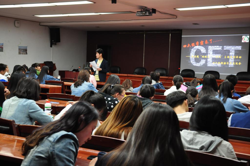 活动受到了大家的广泛关注,同学们积极报名参加了此次交流会。首先,杨青结合自身经验为同学们详细的介绍了考试题型以及快速又牢记单词的方法,同时又把锻炼听力的方法传授给了同学们。白雪给大家介绍了备考方法、复习方法,更是详细的说了考前一周的复习方法:规定时间的情况下完成套题、查漏补缺,翻看错题、熟悉做题顺序,考试流程等。何峰具体实例以及现场互动的方式为同学们讲解了写作方法和考试时间分配技巧,同时学长对改革后的四六级题型做了深层的剖析,并给出了对应的解题技巧。他们一连串的高分绝招和考试技巧的大放送让同学们如获至宝,让大家对四六级考试有了一个更深入的了解,通过新老题型的对比,让我们更加有目的的去复习英语。
