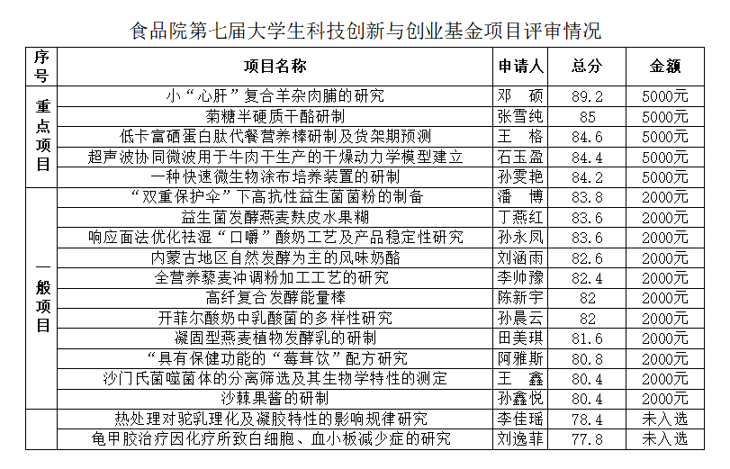 食品院第七届老员工科技创新与创业基金立项评审公示